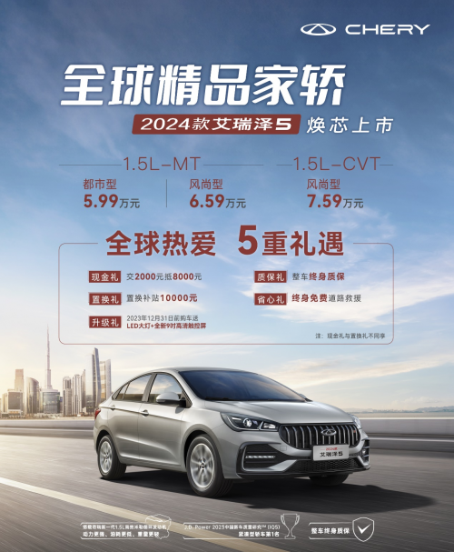 畅销全球80多个国家和地区、斩获全球100万用户的艾瑞泽5,再次焕新,产品进阶。10月20日,2024款艾瑞泽5焕芯上市,共推出1.5L-MT、1.5L-CVT三款车型,市场指导价区间为5.99万元-7.59万元。新车定位“全球精品家轿”,造型、动力、配置全面升级,以超高性价比成为全球用户入门家轿首选。不仅产品竞争力全面提升,2024款艾瑞泽5还为用户带来五重礼遇,刚需可直接入手。
