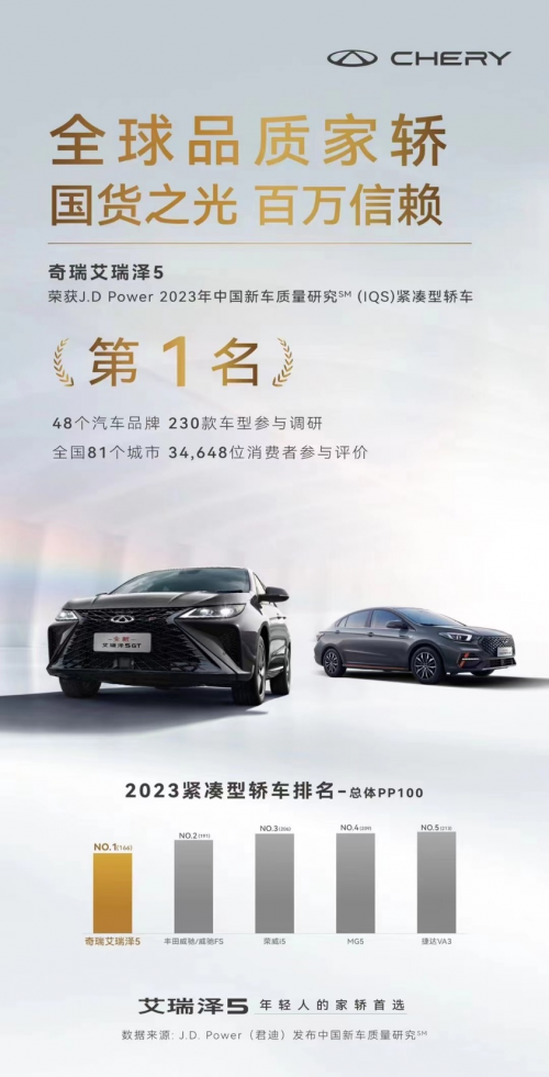 作为奇瑞年轻化战略转型的首款车型,艾瑞泽5问世七年,始终秉持德系“理工”精神和“工程师”思维造车,成为中国品牌畅销全球的家轿标杆。同时,艾瑞泽5是中国品牌第一款敢以世界级标准进行打造的车型,也是第一个运用全球资源、全球标准打造的一款全球车,近期更是荣获J.D. Power 2023年中国新车质量紧凑型轿车第1名,用最强品质赢下中国品牌轿车最高荣耀。同时,艾瑞泽5二手车保值率高达46.49%,荣膺J.D. Power2023年中国汽车保值率风云榜最保值中国品牌轿车车型第3名。